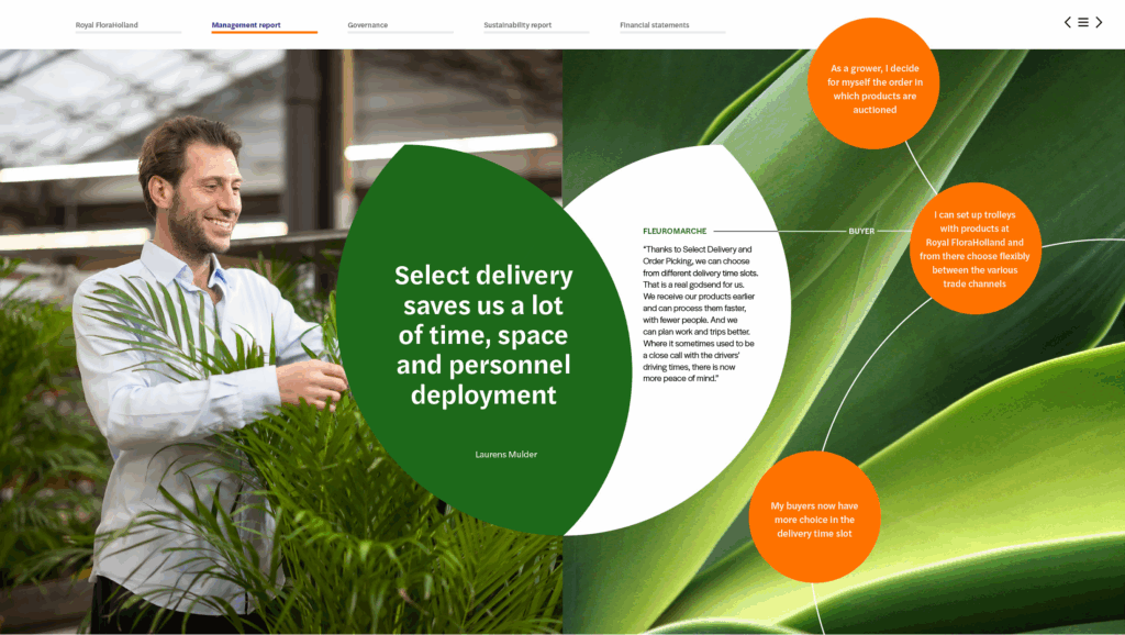 For Royal FloraHolland’s annual report, we advised looking beyond the required overview of figures and disclosures. We proposed placing storytelling at the heart of the report, stories that bring the essence of Royal FloraHolland to life.